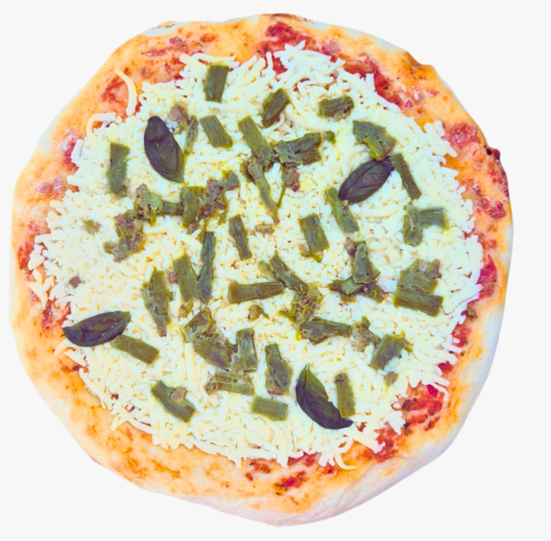 Lejos de las combinaciones tradicionales, esta pizza eleva la experiencia gastronómica a un nuevo nivel. Los espárragos, con su característico sabor terroso y ligeramente amargo, aportan un toque de frescura y una textura tierna que se complementa a la perfección con la intensidad salada y el irresistible crocante de la panceta ahumada. Cada porción es un equilibrio perfecto entre lo robusto y lo delicado, creando una sinfonía de sabores en tu boca.